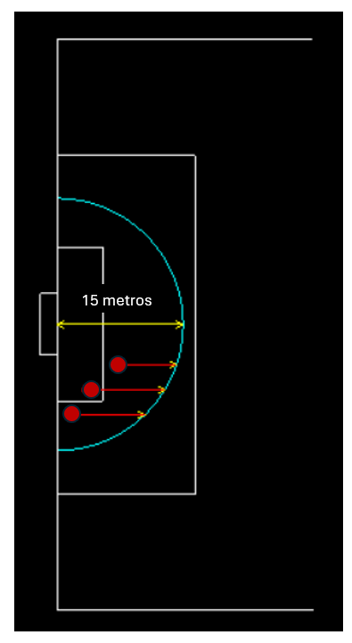 b) Faltas dentro do semicírculo: em vez do penálti automático a 11 metros, a bola é recuada em linha reta até encontrar a linha do arco (como mostra o diagrama). O livre é batido sem barreira, a uma distância fixa de 15 metros. É um castigo severo e frontal, mas que exige perícia técnica do batedor e premeia os reflexos do guarda-redes.